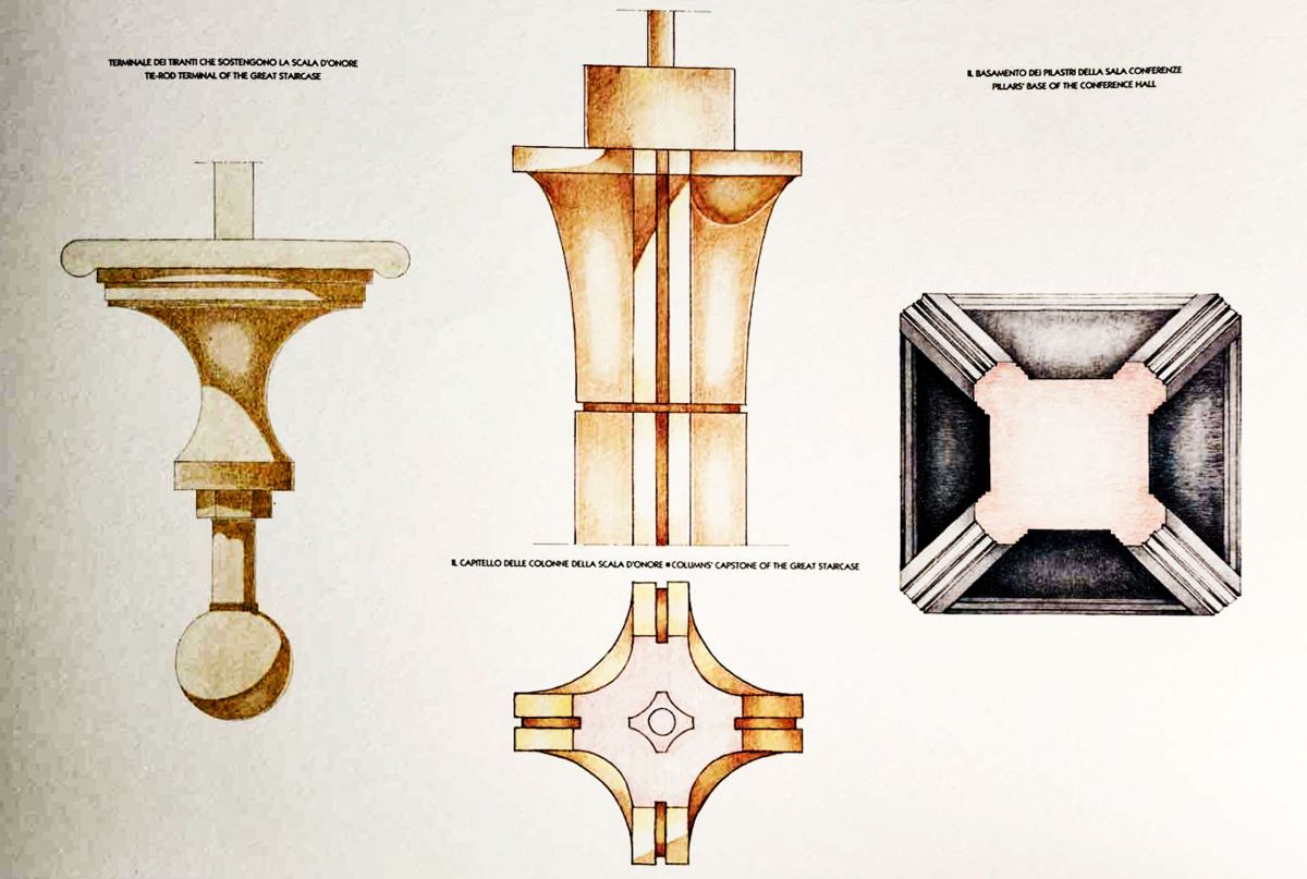 Lo stile di Eroli si fonde in modo armonico con il fulcro dell’intero progetto, la scala elicoidale, per la quale si è pensato all’intervento di due artisti assolutamente in linea con il clima metafisico dell’ambiente.